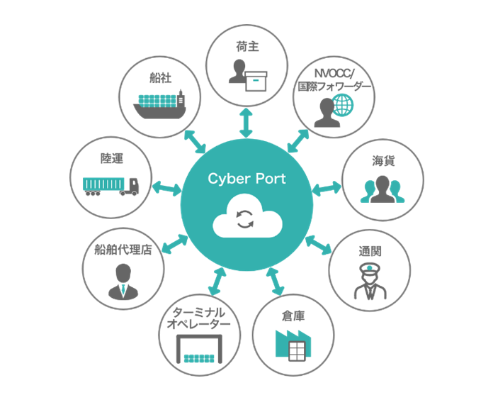 サイバーポート(港湾物流分野)においては、紙、電話、メール等で行われている民間事業者間の港湾物流手続を電子化することで業務を効率化し、港湾物流全体の生産性向上を図ることを目的としています。